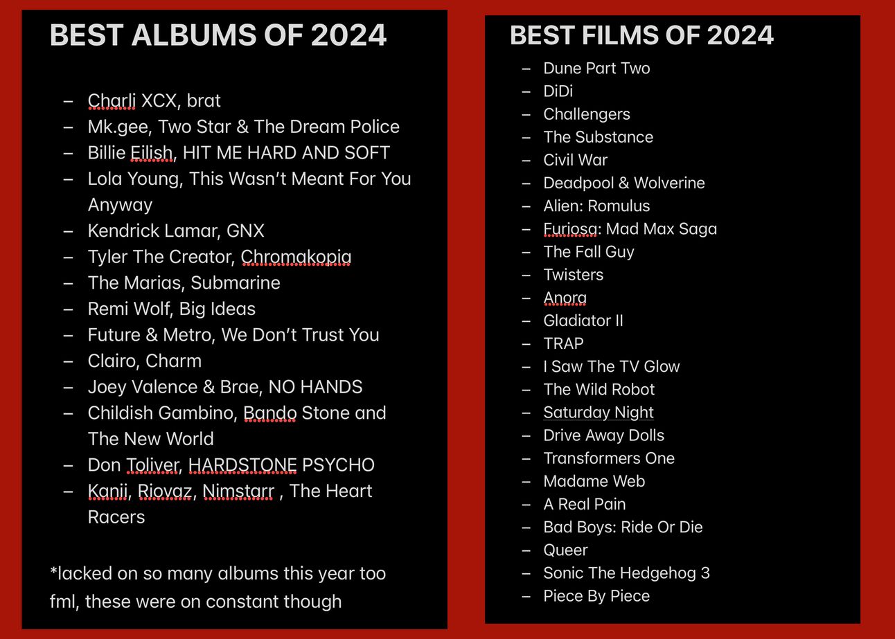 If you’re getting this it’s Christmas, I wanted to send you a bunch of end-of-the-year lists, well two, one for music and of course one for movies. I think this year I found my love for music back again, slowly but surely and I’m so grateful for that. This is a moment of pure reflection and gratitude for everything we did this year. Bailando is finally finished, we’re off to festivals next year, so be on the lookout for those announcements. Friendsgiving is getting placed in festivals and several screenings next year. Dos Golpes is finally in post-production and will be edited after I send this out. We have a lot of things to look forward to next year and a lot of things to be thankful for happening this year and I want to say thank you to you for helping me make these things happen. I hope you’ve enjoyed your 2024 and I hope you enjoy your 2025. I’ll see you next year.